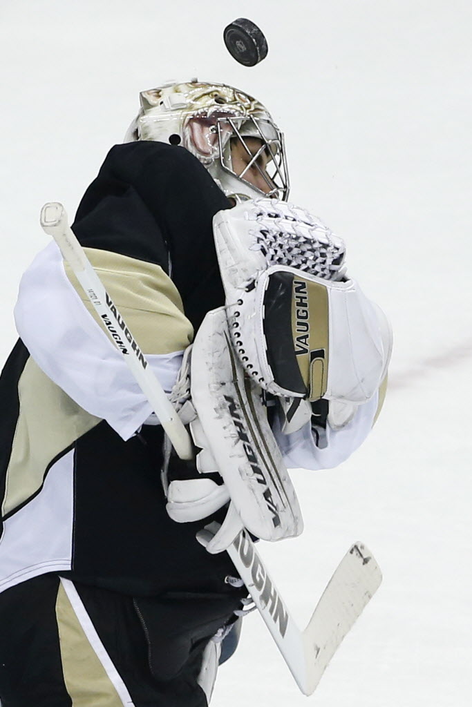 Pittsburgh Penguins goalie Thomas Greiss stops a shot during the first period.