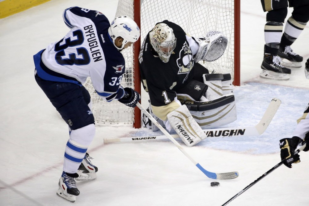 Gene J. Puskar / The Associated Press Winnipeg Jets' Dustin Byfuglien (33) can't get a shot off in front of Pittsburgh Penguins goalie Thomas Greiss during the first period in Pittsburgh Tuesday.
