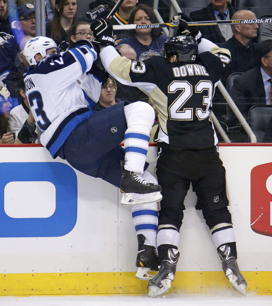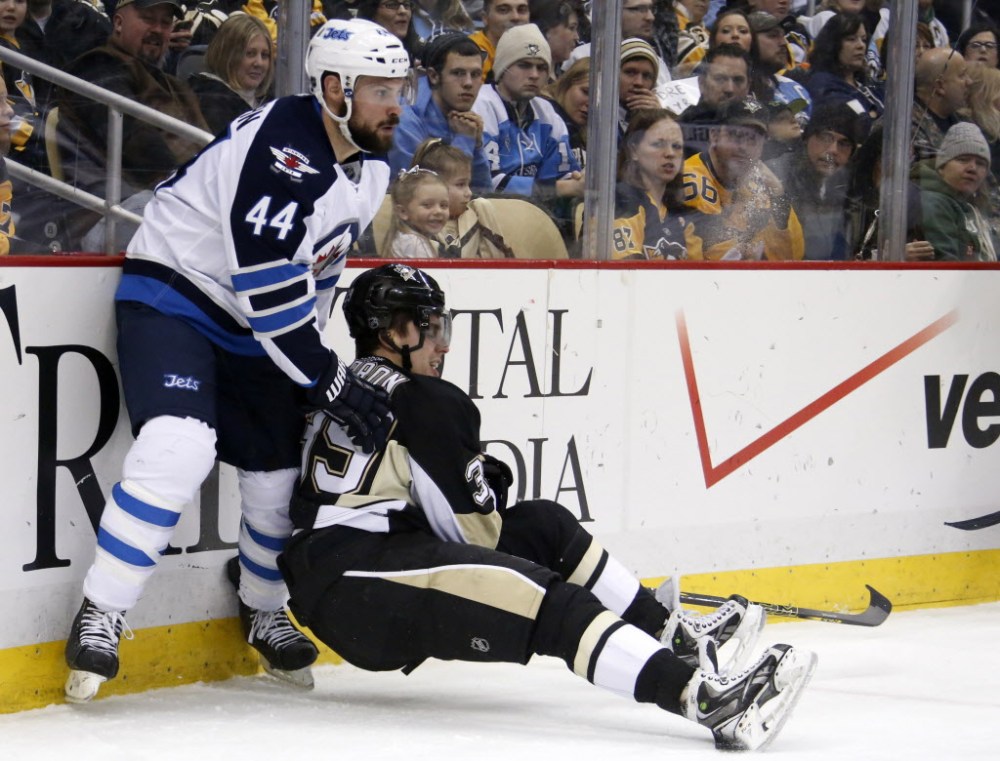 Gene J. Puskar / The Associated Press Winnipeg Jets' Zach Bogosian (44) and Pittsburgh Penguins' David Perron (39) collide.