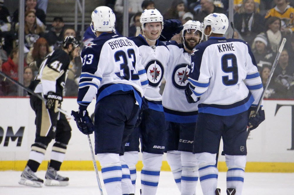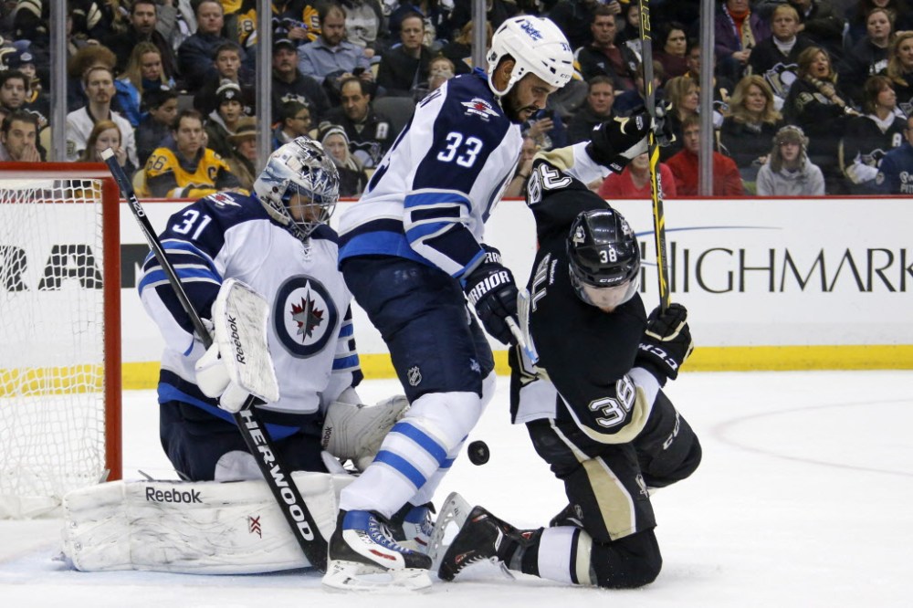 Gene J. Puskar / The Associated Press Winnipeg Jets goalie Ondrej Pavelec (31) stops a shot as Dustin Byfuglien (33) checks Pittsburgh Penguins' Zach Sill (38) to the ice.