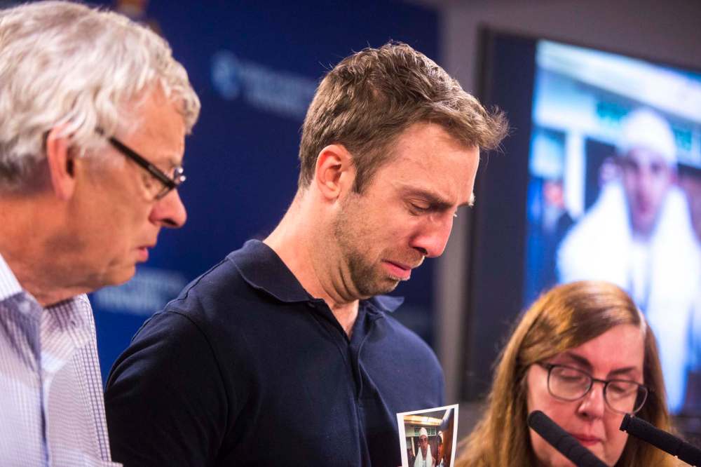 Michael Silicz, brother of slain lawyer Justin Silicz, reads a statement at a police press conference with with parents Walter and Nicole Silicz on June 7. (Mikaela MacKenzie / Free Press files)