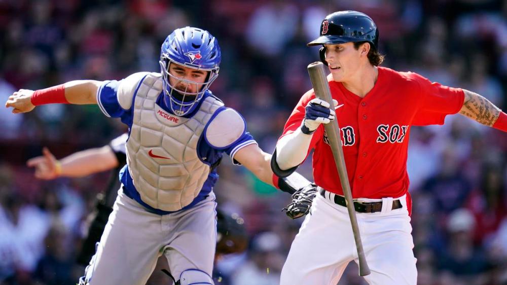 Blue Jays catcher Reese McGuire tags out Boston Red Sox pinch-hitter Jarren Duran on a strikeout in Wednesday’s doubleheader at Fenway Park.