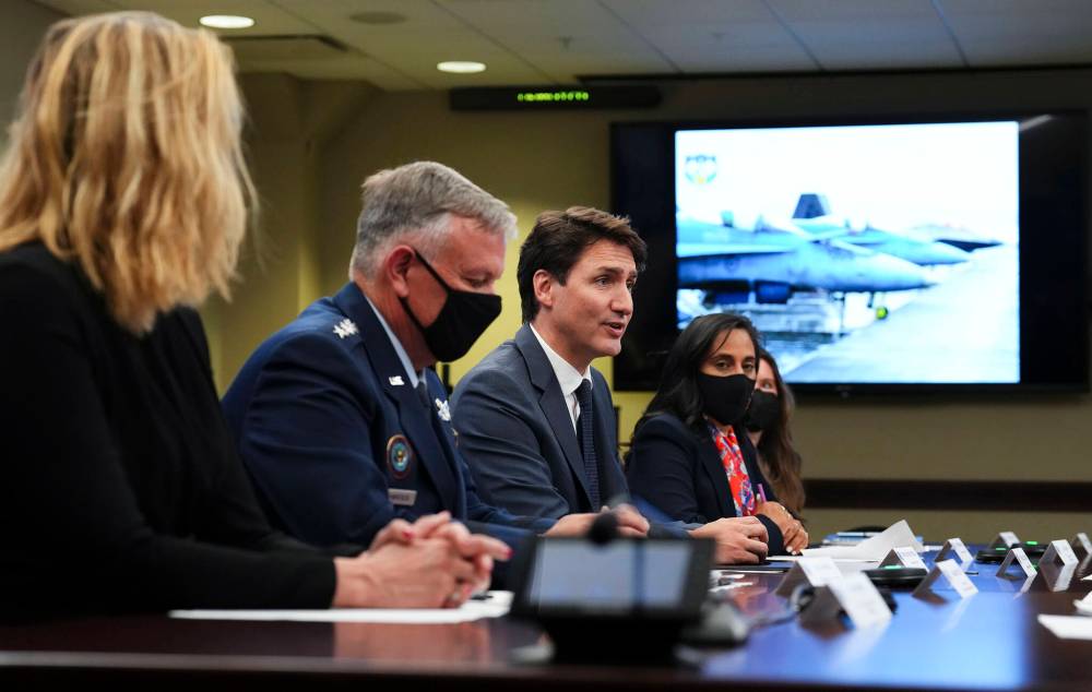 Prime Minister Justin Trudeau, centre, takes part in a briefing at North American Aerospace Defense Command and United States Northern Command Headquarters in Colorado.