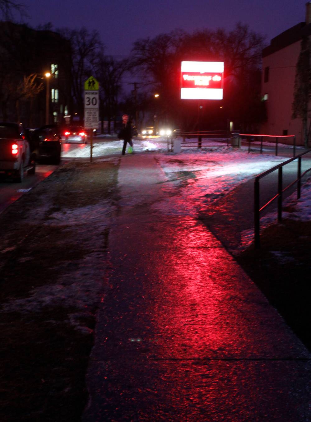 As long as the surface remains frozen and compacted, it’s fine; but on warmer days throughout the winter, it becomes soft and, as people walk over it, the surface breaks up, becoming pitted and uneven with slush and water filling the crevices that form in the layer of snow.