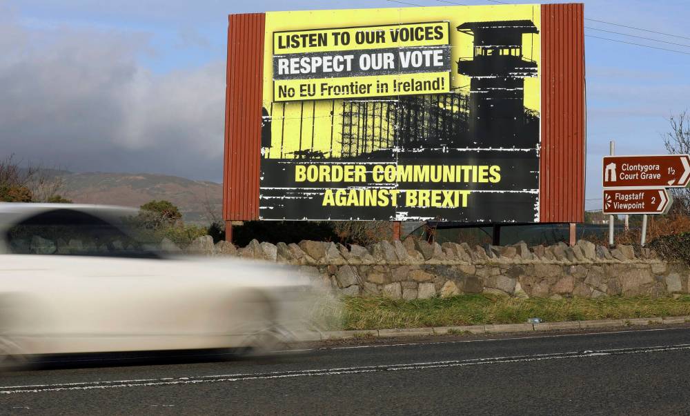 A motorist makes their way north along the old Belfast to Dublin road on the Irish border between Northern Ireland and the Irish Republic in 2018. (Peter Morrison / The Associated Press files)