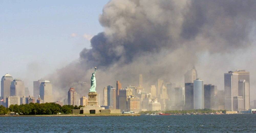 The Statue of Liberty stands as smoke billows from the World Trade Center in New York on Tuesday, Sept 11, 2001.
