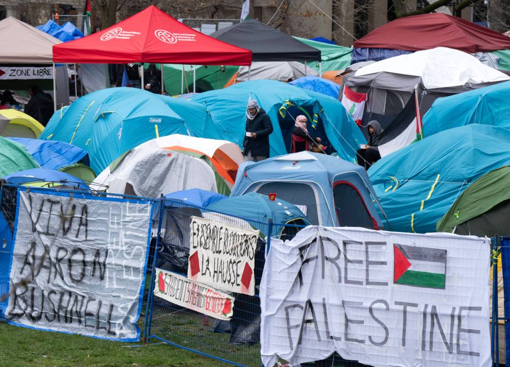 Pro-Palestinian activists at their encampment on the McGill University campus April 30 in Montreal.
