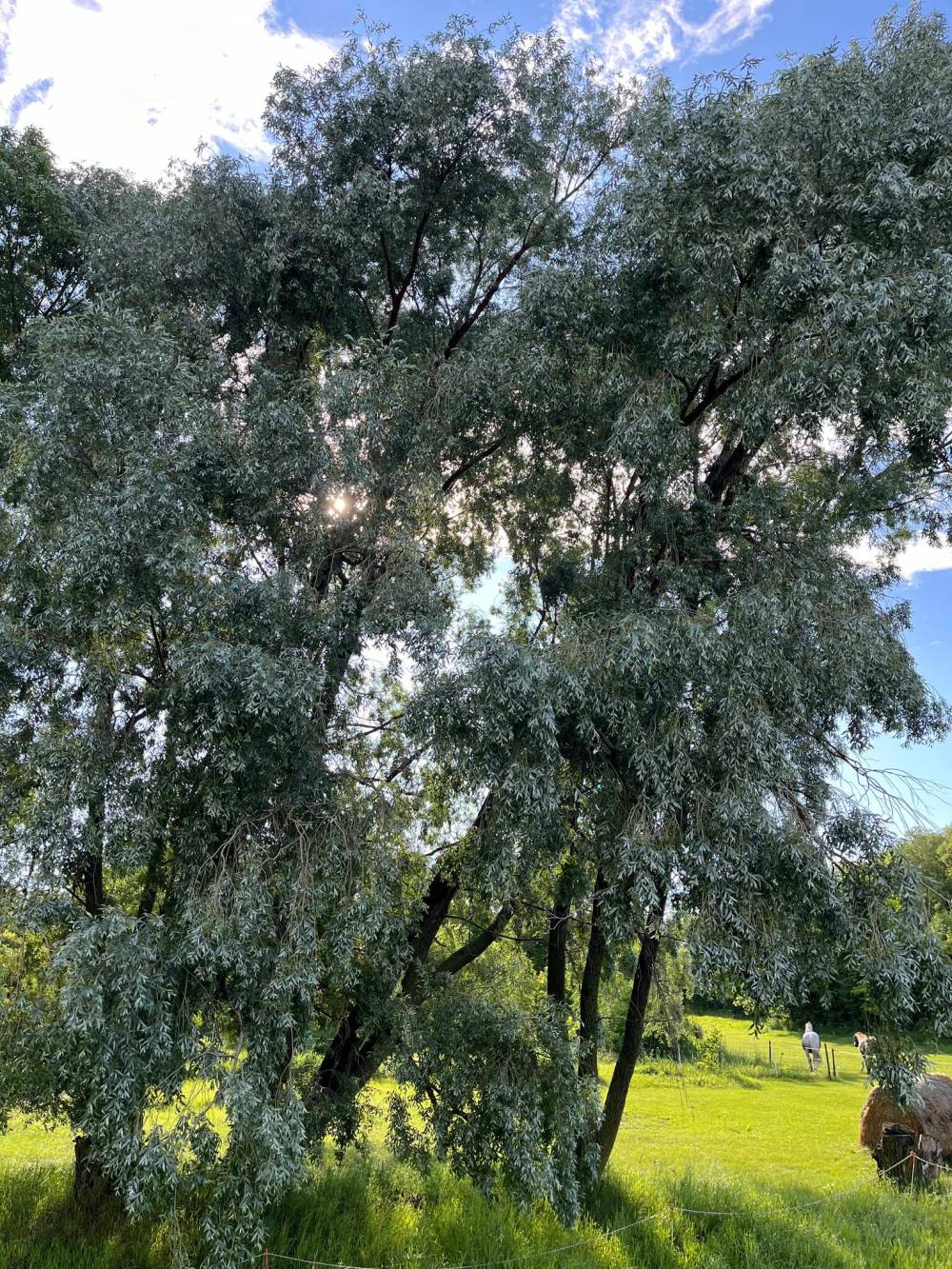 There is pasture in behind the willows, framed with the man-made straight lines of electric fence, and two horses swing their tails and bow their heads to clip the grass.