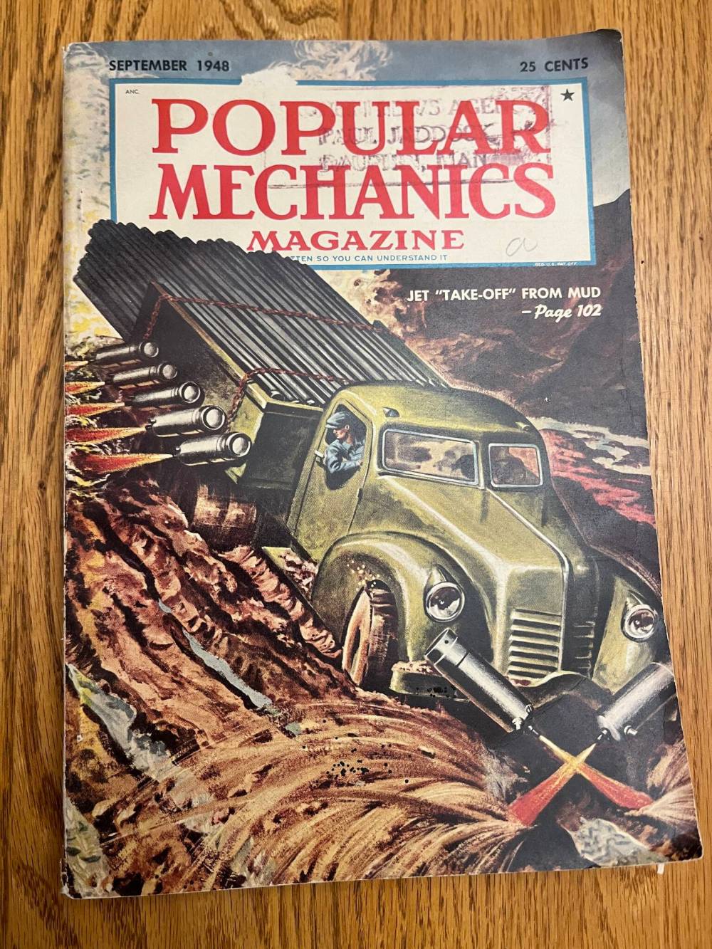 The September 1948 issue of Popular Mechanics had odd cover art. It showed a Second World War-style U.S. army truck, stuck in the mud, but being extricated by rockets attached to its sides and bumpers.