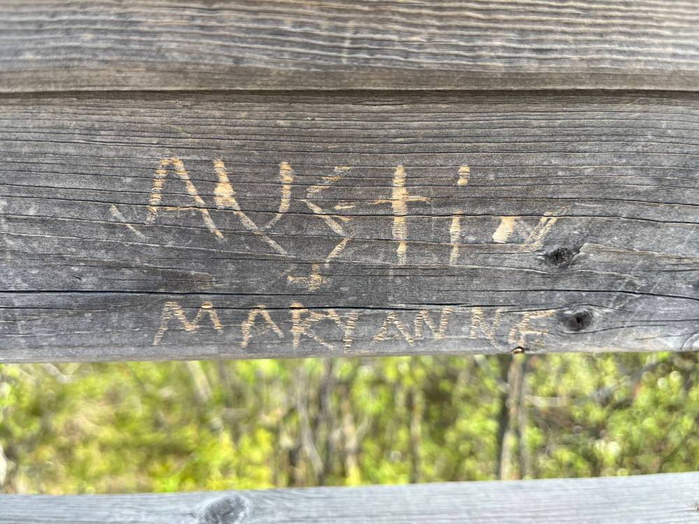 Later, up the grey, weathered wooden stairs to a lookoff over the dunes, interpretive signs to tell you what you could see — one defaced with heavy Sharpie graffiti — and every single surface of the greyed wood railing was carved with initials and names, the important and necessary proofs of who loved whom at one precise moment in time, and who was exactly right here, at this railing, on May 15, 2019, holding that essential point-down penknife.