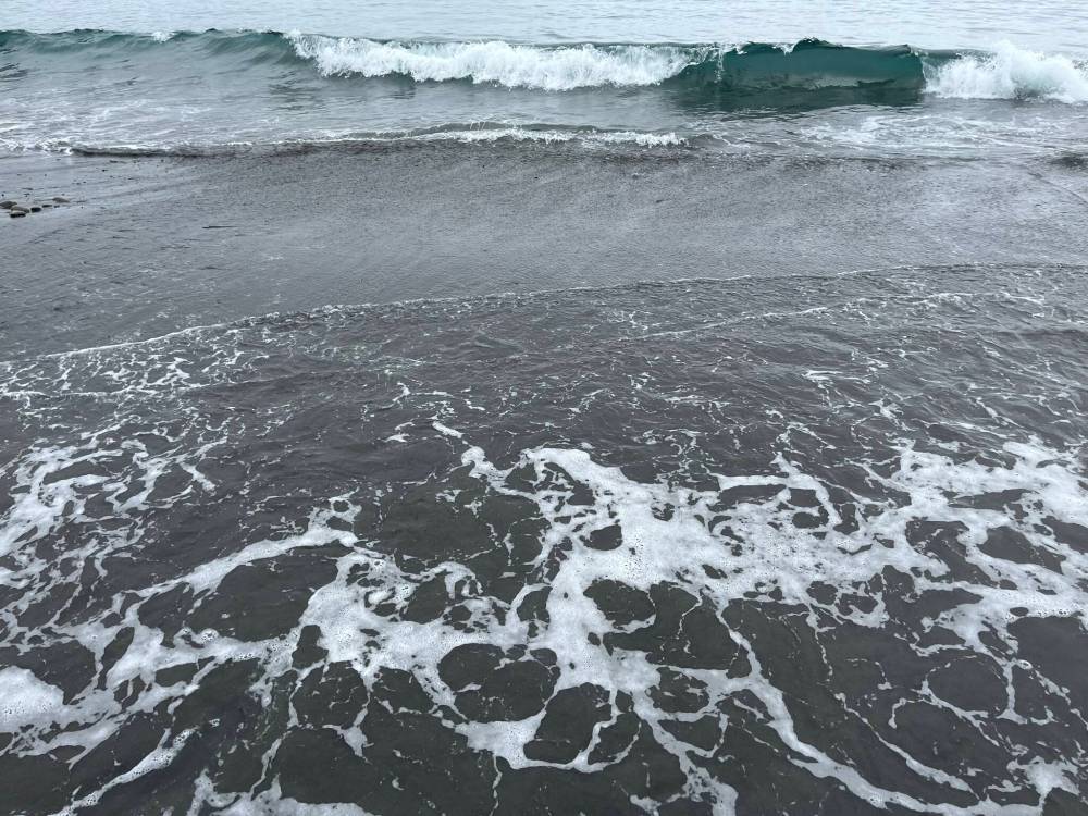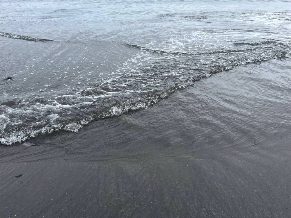 Tuesday was the biggest change. A small brook comes through the sand beach from behind a rock barrisway — a big berm of rounded beach stone, rocks ranging from the size of a large beach ball to baseball-sized and smaller — sometimes through an actual break in the rocks, but also by bleeding through the inevitable cracks between the stones.