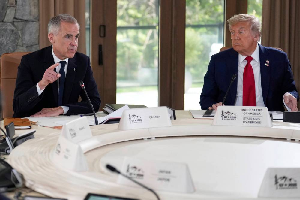 U.S. President Donald Trump, right, and Canada’s Prime Minister Mark Carney participate in a session of the G7 Summit, June 16.
