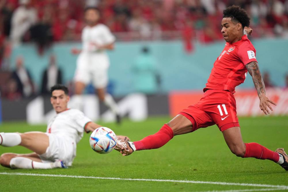Canada forward Tajon Buchanan (left) tries to get his foot on a pass during the 2022 World Cup in Qatar. The former host country was drawn into Canada’s Group on Friday along with Switzerland and the winner of the UEFA playoff in March.