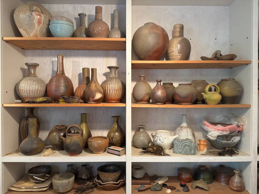 The long wooden tables were still covered with finished and unfinished vessels, shelves lined with hundreds of books and walls carrying drawings, notes, photographs and the ephemera of a life devoted to clay. It was as if the studio were holding its breath, waiting for the next firing.