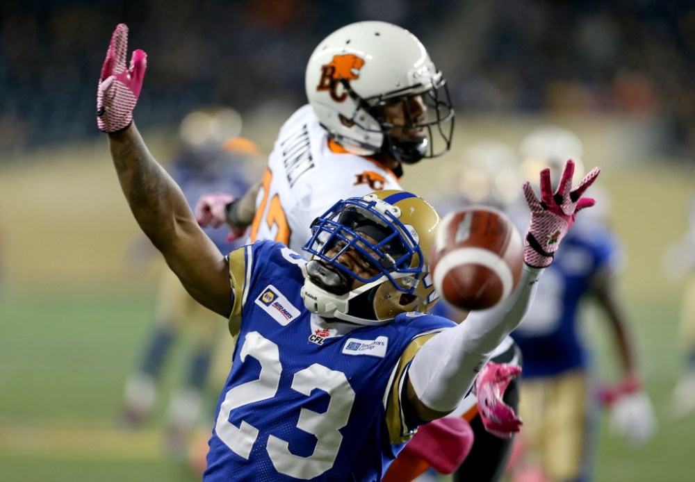 Winnipeg Blue Bombers' Desia Dunn (23) reaches for the ball as he covers BC Lions' Lavasier Tuinei (82) on Saturday.