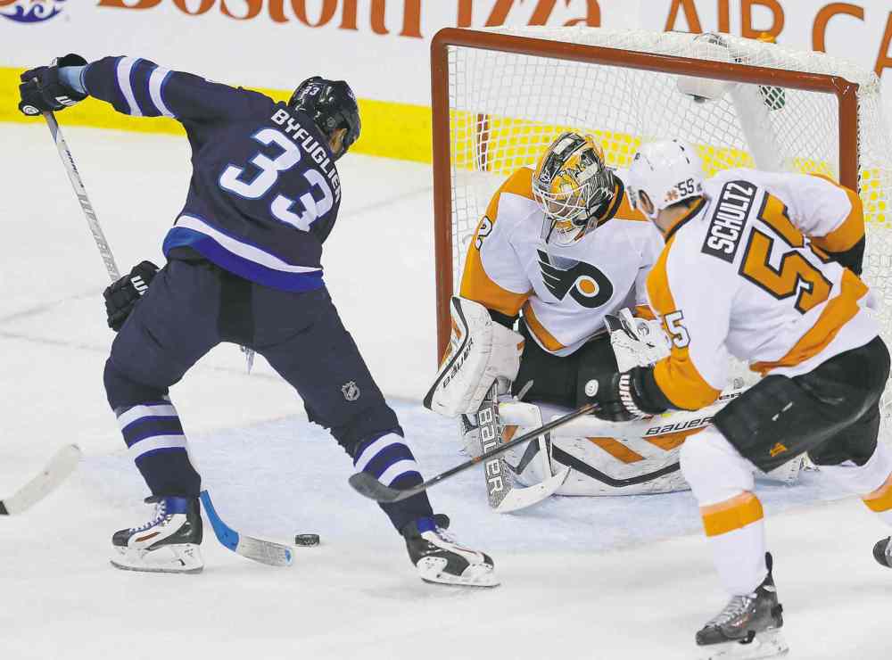 John Woods / WINNIPEG FREE PRESS Dustin Byfuglien scores on Philadelphia Flyers goaltender Rob Zepp.