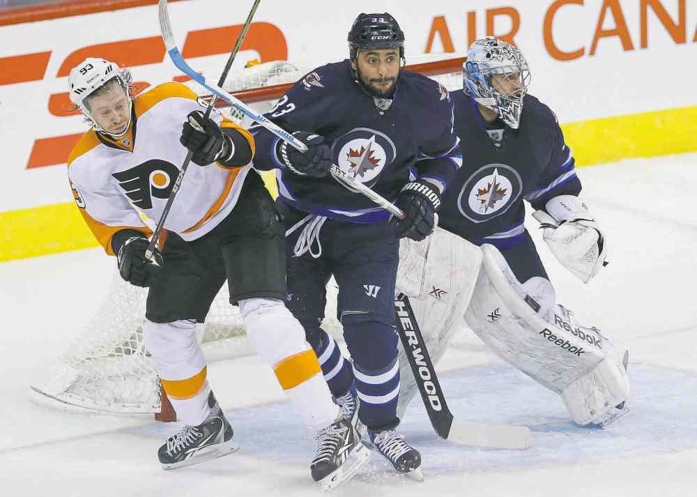 Jets blue-liner Dustin Byfuglien clears the Philadelphia Flyers' Jakub Voracek from in front of Ondrej Pavelec.