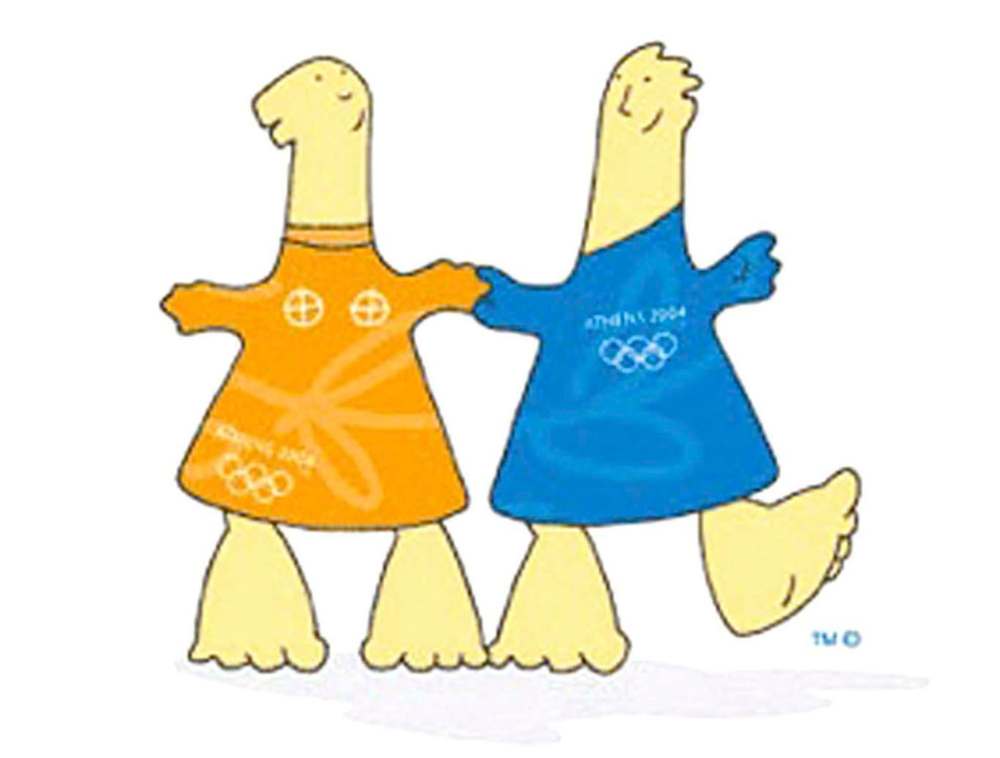Don’t stare, sweetie. They’ve just got their own thing going on.” To us, they resembled cone-shaped tents with giant Neanderthal feet on the bottom and weird wiener-shaped heads on top. They were modelled after a bell-shaped terracotta doll and their names are a reference to two gods of Olympus — Athena, goddess of wisdom, and Phevos, a modern pronunciation of Phoebus, which is another name for Apollo. “The two mascots thus symbolize the link between ancient Greece and the Olympic Games of the modern era,” chirps Olympic.org.