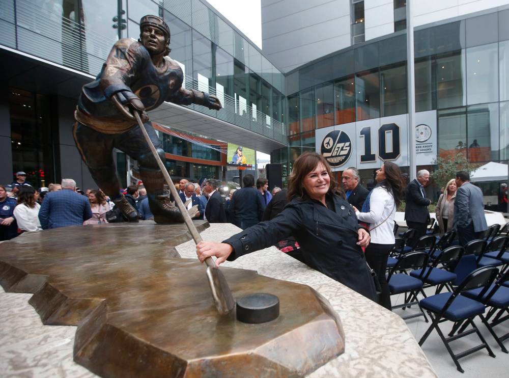 Crystal Hawerchuk poses with the statue of her late husband and former Winnipeg Jets star Dale Hawerchuk on Saturday.