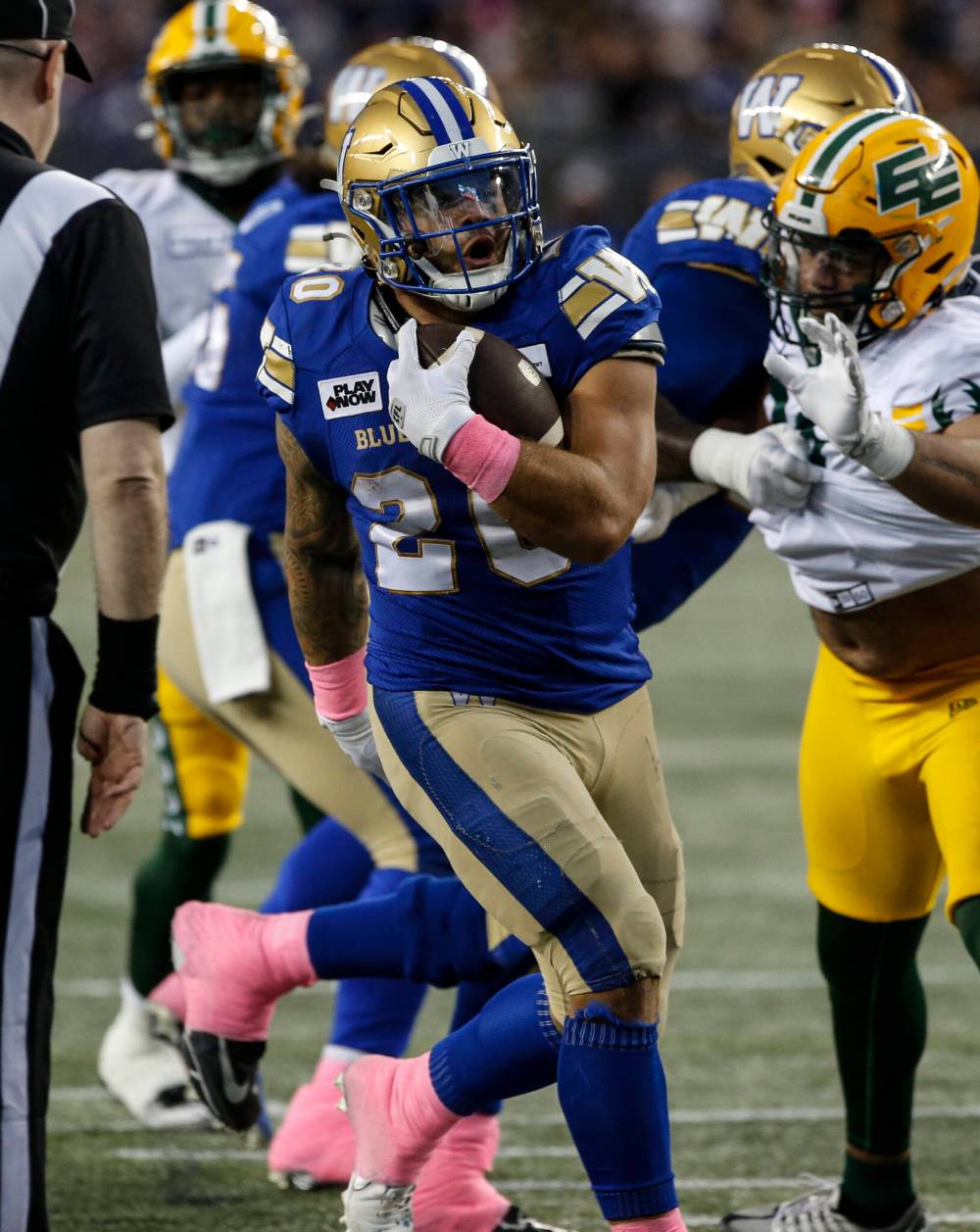 Winnipeg Blue Bombers’ Brady Oliveira (20) runs in for the touchdown against the Edmonton Elks during the first half. (John Woods / The Canadian Press)