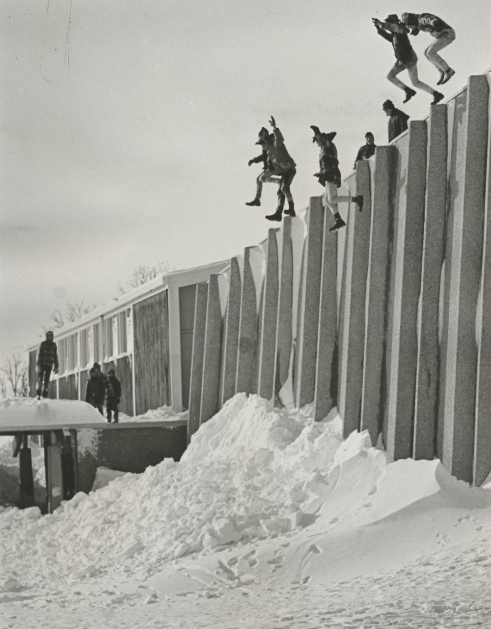 Don't try this at home, kids: A group of children use snowbanks as landing pads as they leap off the roof of Silver Heights United Church after the blizzard of 1966 (well before the snowbanks of Jen Zoratti's youth).