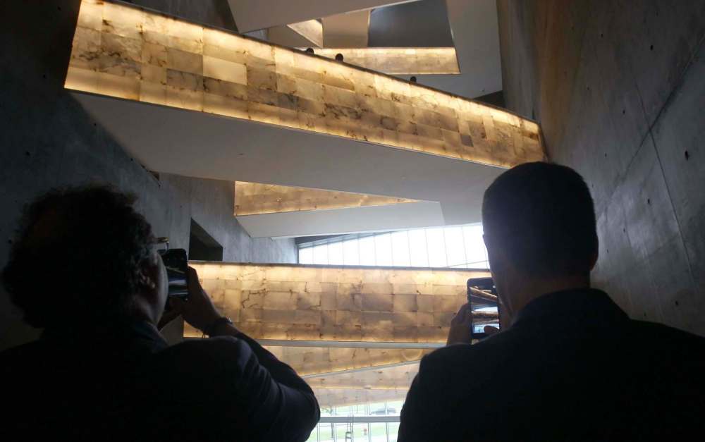 Calgary Mayor Naheed Nenshi, left, with Winnipeg mayor Brian Bowman in the Canadian Museum for Human Rights on a tour Wednesday.