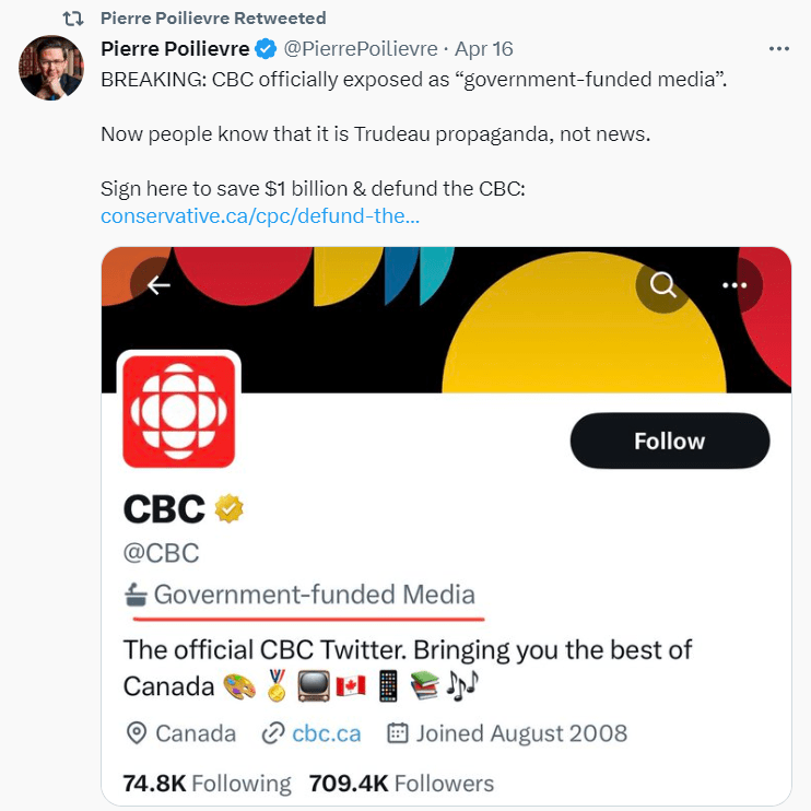Mr. Poilievre’s post came after he requested, earlier in April, that the CBC be identified that way. Twitter acquiesced, adding the line on the main CBC Twitter site.