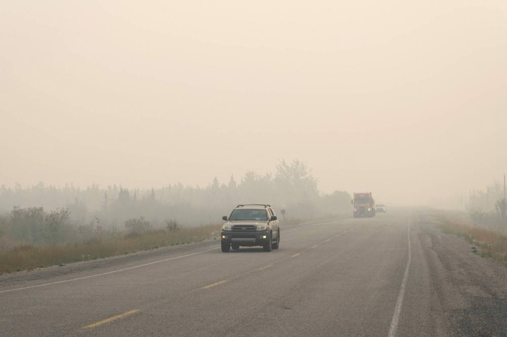 Vehicles leave Yellowknife after a state of emergency was declared on Wednesday.