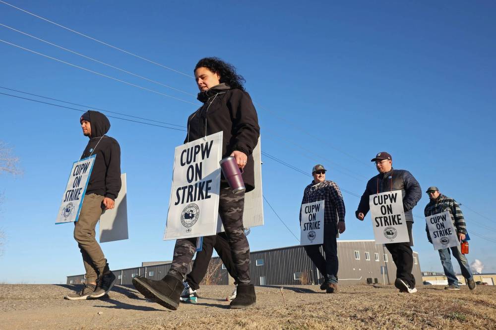Striking Canada Post workers picket outside Canada Post’s Brandon mail processing plant.