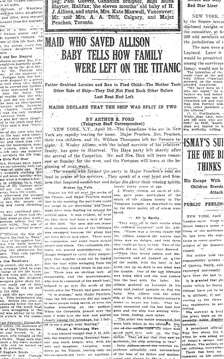 On April 19, the Telegram ran several stories by Ford. In one, headlined Winnipeg Men, It Is Now Certain, Went To Death When The Riven Titanic Took Its Fateful Plunge, he confirmed Mark and Charles Fortune, Borebank, Graham, Beattie and Ross were lost when the Titanic foundered, but Albert and Vera Dick had survived.