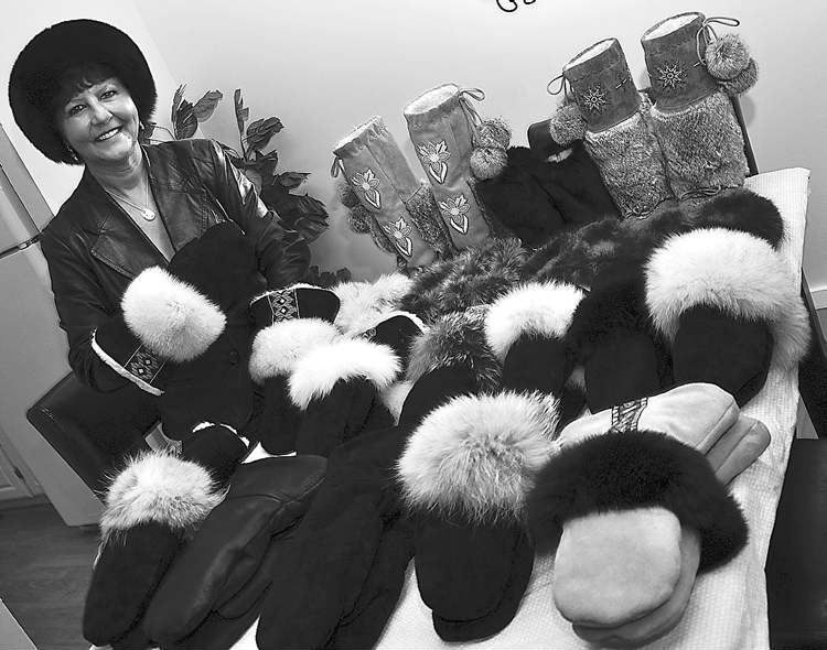Les produits de Flo’s Leather Crafts, des mitaines, des bottes, des bandeaux et des pantoufles, sont tous en fourrures et peaux, parfois décorées de perles.
