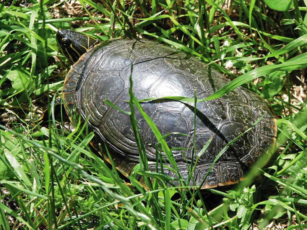 The Seine River is an urban refuge for both species of Manitoba turtles. The more familiar species is the western painted turtle (Chrysemys picta). These small turtles are often seen basking on logs at the edge of the river. The painted turtle gets its name from the bright yellow and red markings on its neck, head, and underside.