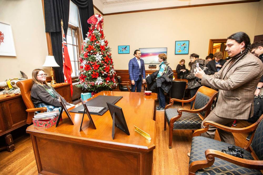 A group of students from Beausejour were invited to try out the premier’s chair and chat with Wab Kinew iduring a visit to the Manitoba legislature on Dec. 15.