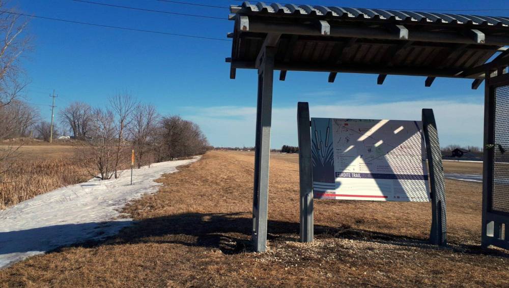 This sign on the east side of Lagimodière Boulevard, north of Grassie Boulevard, marks the Cordite Trail.