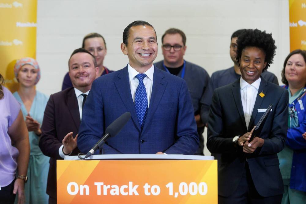 Premier Wab Kinew (pictured here at a press conference updating the government’s progress on hiring health-care workers) reflect back on the NDP government’s first year in office.