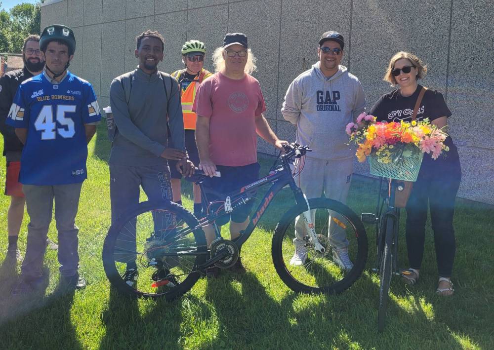 From left: Northeast Local Bike Group chair Adam Johnston, Zekaria Selahadin, Bike Winnipeg executive director Mark Cohoe, Abel Josè Gutierrez, and Emma Durand-Wood at an Aug. 16 group ride organized by the NE LBG.