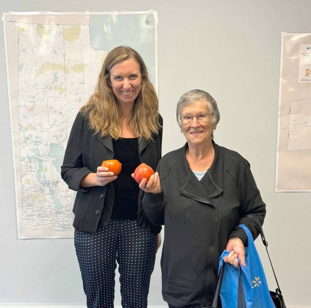 MLA Rachelle Schott with one of many seniors who popped by the Kildonan–River East constituency office to pick up fresh garden tomatoes.