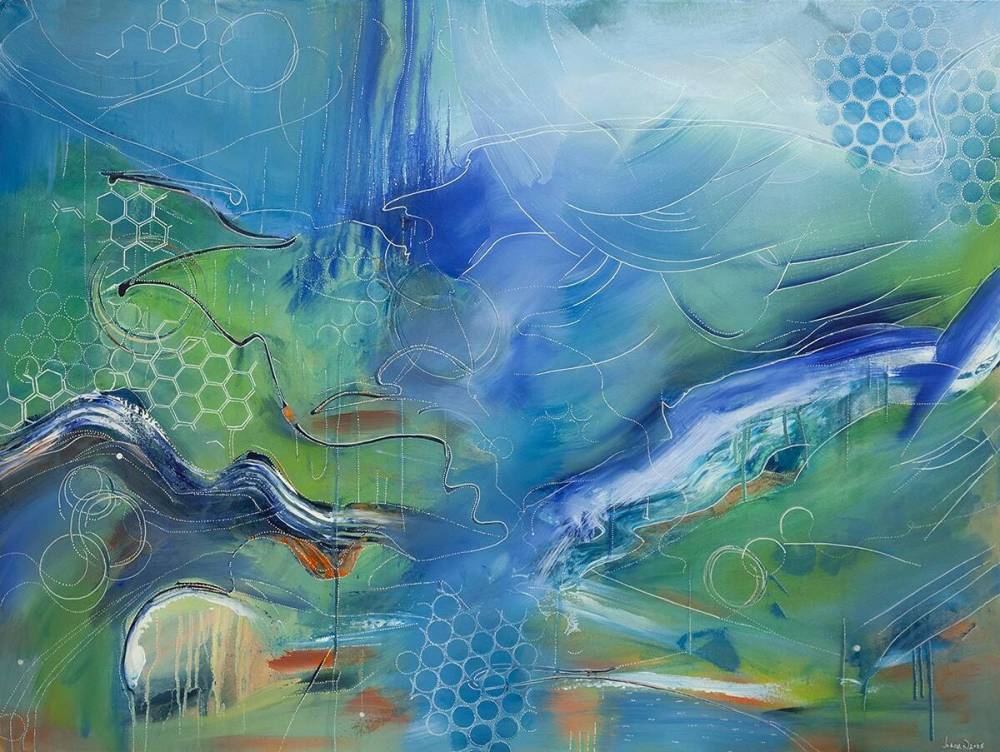 One example of the former is Queen Bee, an abstract piece which uses honeycomb shapes to represent Miller’s experience of “protecting the hive,” the hive in question being cre8ery.