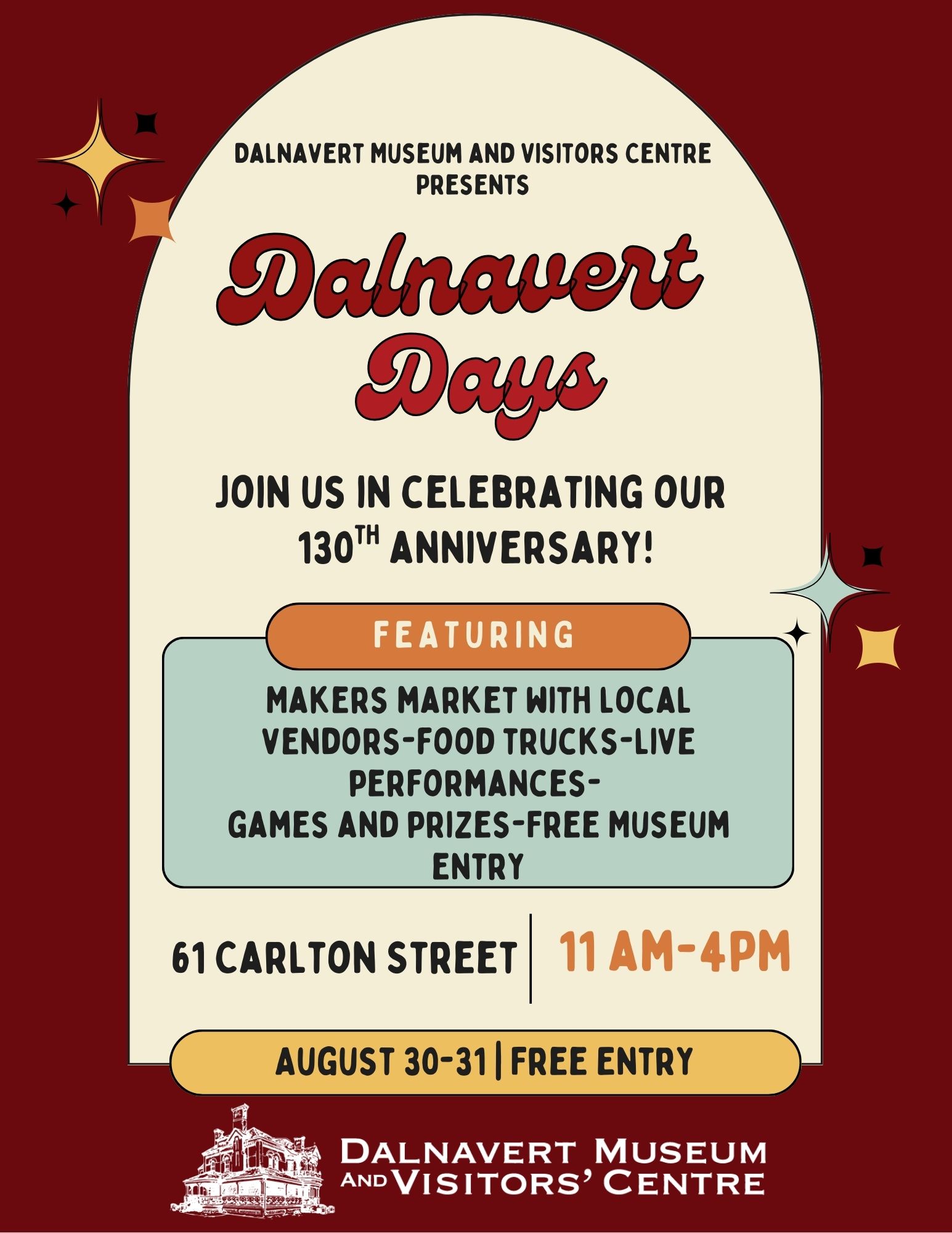 On August 30th-31st 11am-4pm, join us for Dalnavert Days! Join us for the second annual edition of our community festival featuring a makers market, food trucks, family-friendly activities and FREE entry to the Dalnavert Museum! The events will take place during the daytime on Saturday and Sunday. This event is free and open for the general public to attend!