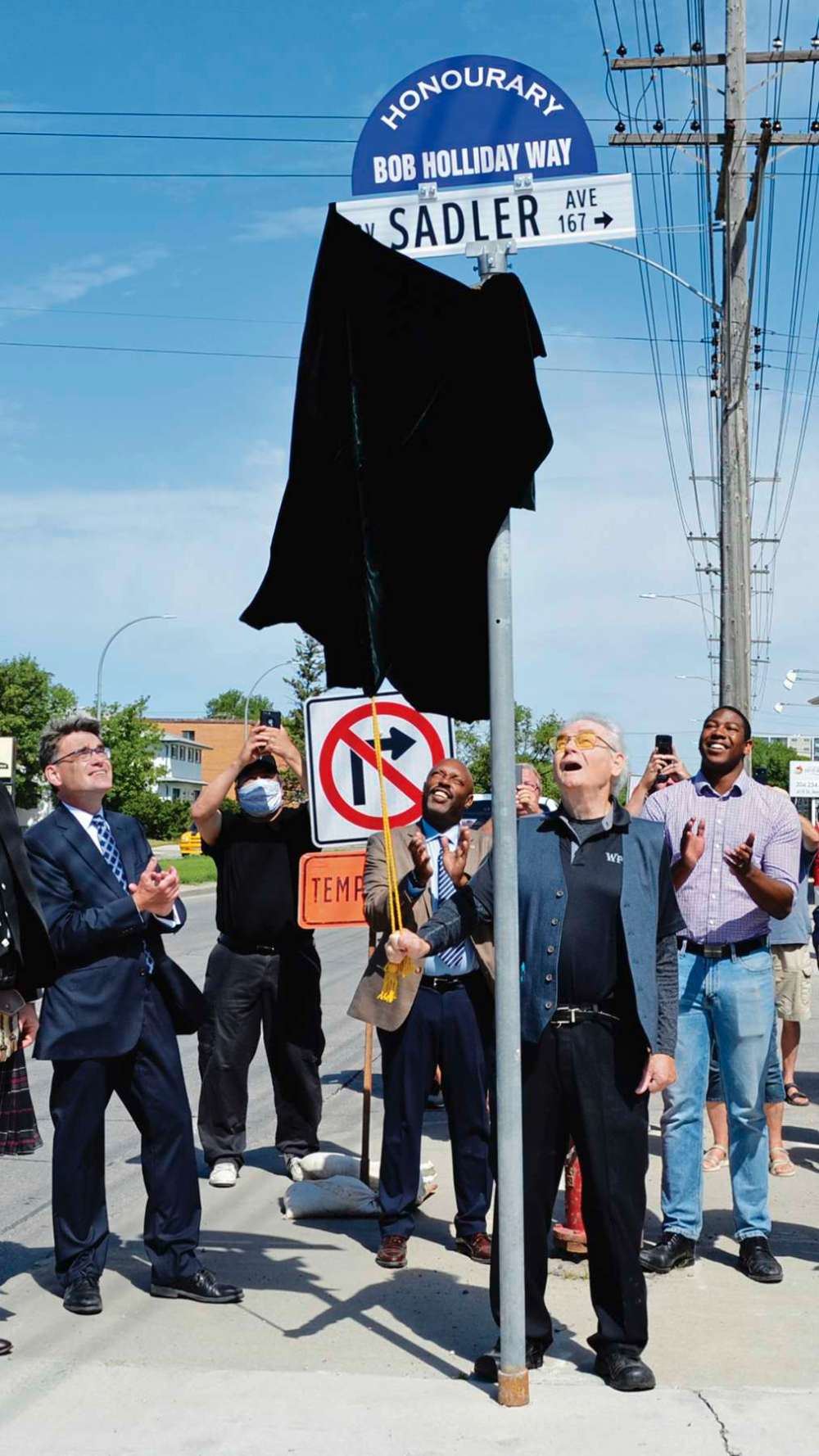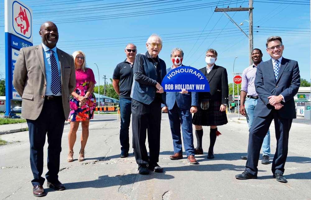 Lifelong St. Vital resident Bob Holliday — who has been a journalist, sports organizer, ring announcer and wrestling promoter, among other things, during his long and colourful career — was recognized for his contributions to the community with the renaming of the eastern portion of Sadler Avenue as Bob Holliday Way on Wed., July 22, and he certainly drew a crowd of local dignitaries. Pictured, above right, are (from left): Coun. Markus Chambers (St. Norbert-Seine River); Riel MLA Rochelle Squires; Winnipeg Police Association president Maurice (Moe) Sabourin; Holliday; Saint Boniface-Saint Vital MP Dan Vandal; St. Boniface MLA Dougald Lamont; St. Vital MLA Jamie Moses; Coun. Brian Mayes (St. Vital).