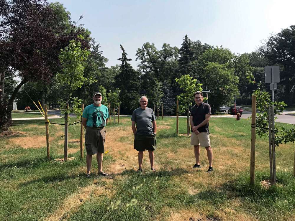(From left) Kingston Row Boulevard Group’s Ted McLachlan and Lynn Webster are pictured with Coun. Brian Mayes (St. Vital) recently. Mayes provided $2,500 in ward funds to help the group with tree-planting in the greenspace located at Rosewarne Avenue and Kingston Row, which was created by traffic-calming measures built in 2020, Mayes said. Part of the group’s mandate is to water and tend to the new trees.