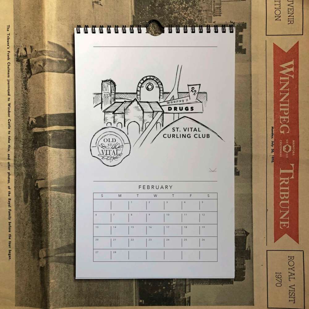Kuzdub said each calendar month features a different community depicted by a hand-drawn design. The neighbourhoods include recognizable landmarks, signage, notable river bends, and “even some infamous roadways that give each neighbourhood its unique character and identity.” In southeast Winnipeg, there are months dedicated to St. Boniface and Old St. Vital.