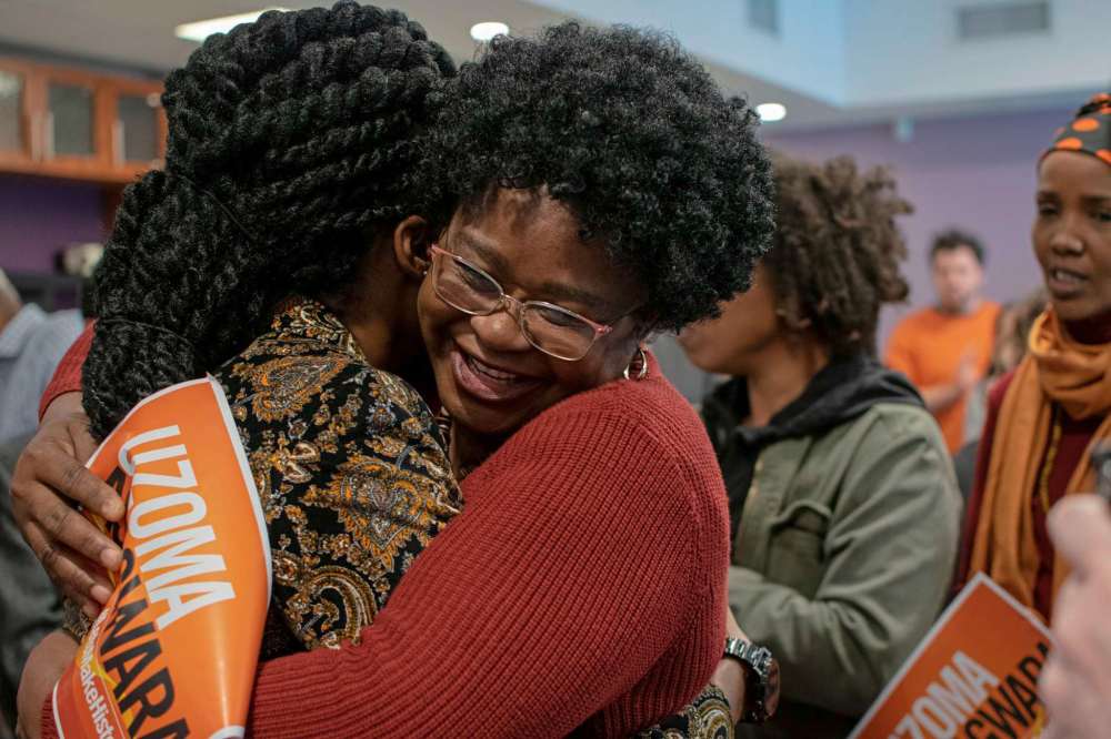 Uzoma Asagwara hugs her mom following her announcement to seek the NDP nomination in Minto if current MLA Andrew Swan is selected to run federally for the NDP.