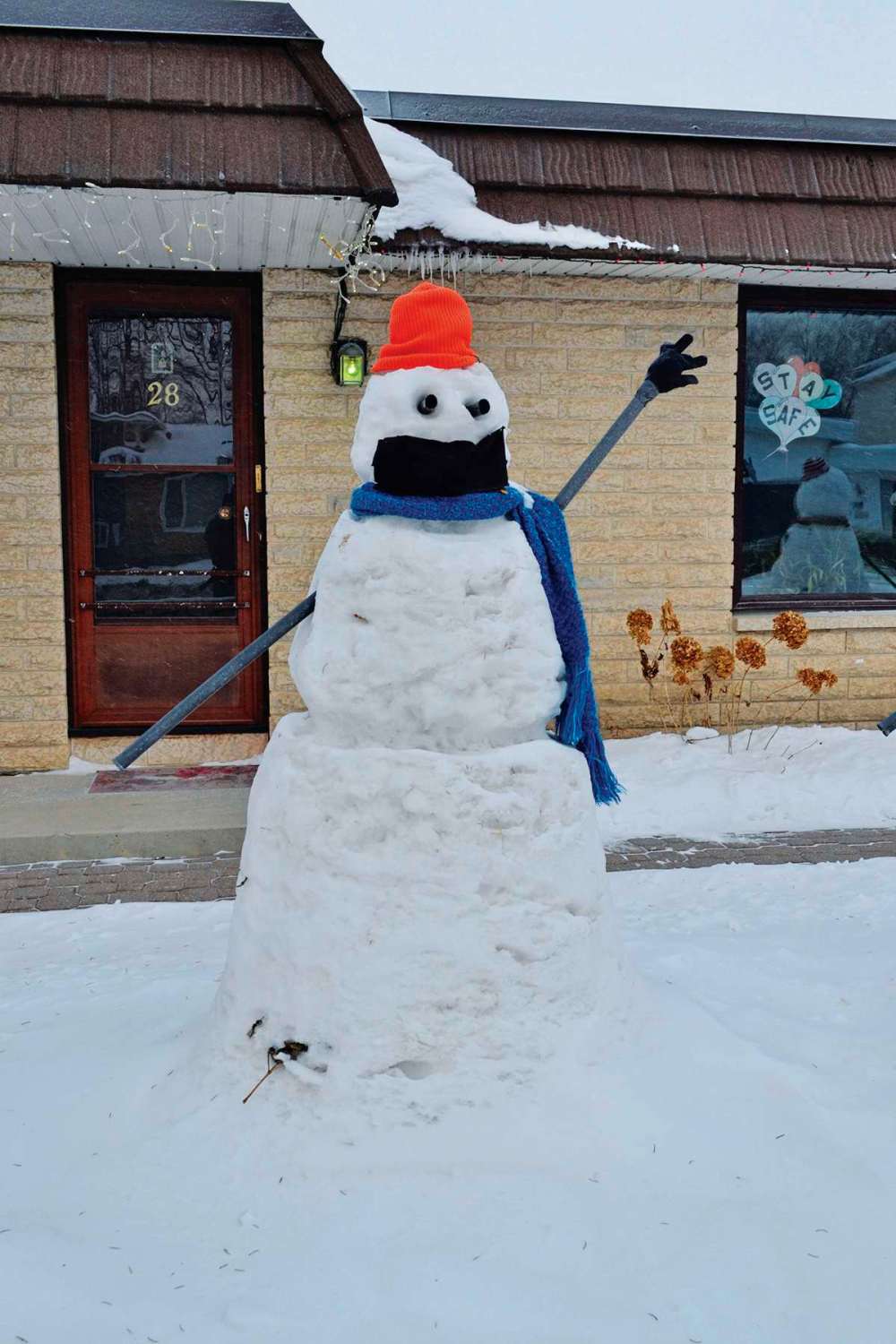 Even the snowmen are wearing masks these days, as seen on the faces of these four snow figures, who stand facing the street outside the Pinewood Village condominium complex at 2805 Ness Ave. But hey, they’re physically distanced from one another.