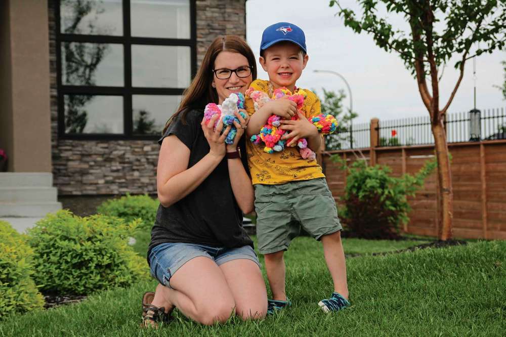 Photo by Katlyn Streilein Mallory MacEachern and son Daniel hold bunches of colourful yarn water ‘balloons’ made and sold by MacEachern.
