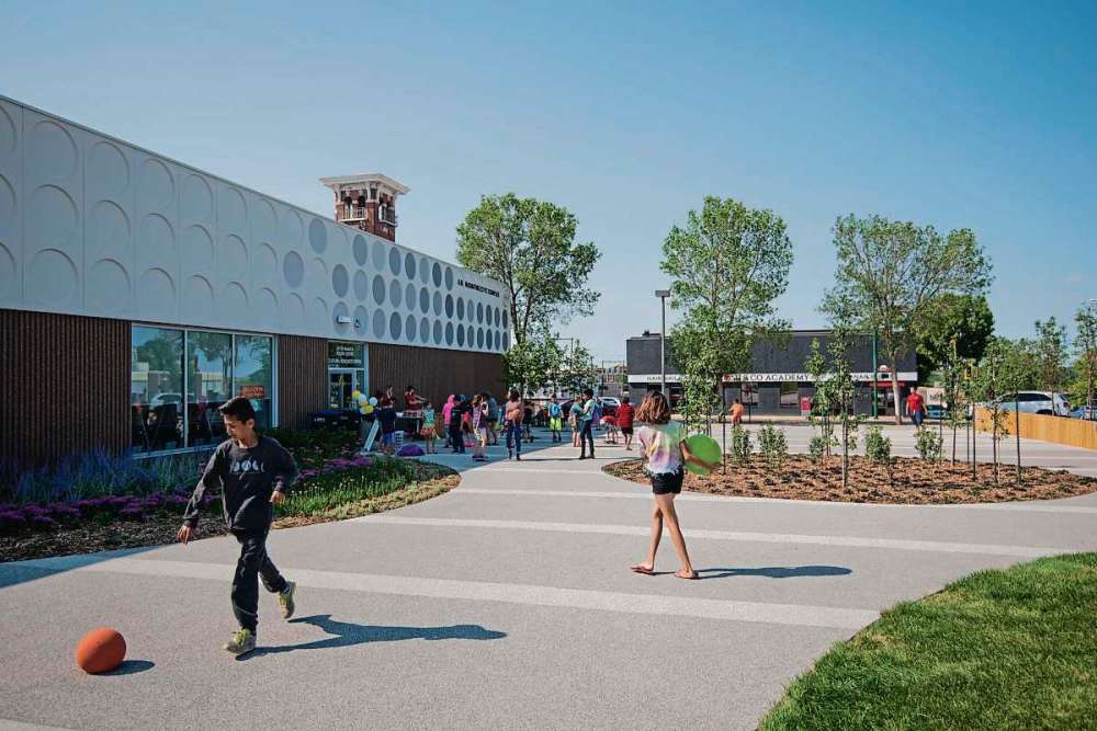 The concept of “pods’’ was designed to complement the existing architectural language of the building and to serve as loosely programmed space for youth and cultural activities. Previously a parking lot, the greenspace now provides a community garden; an active play area for unorganized sports; a grassy berm for seating; café-style seating; and a fruit orchard. Poured recycled rubber paving was used to connect and enhance the “pod” design, providing a playfully patterned backdrop to the space.