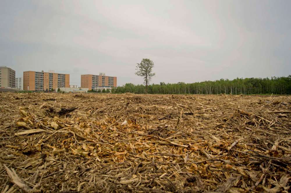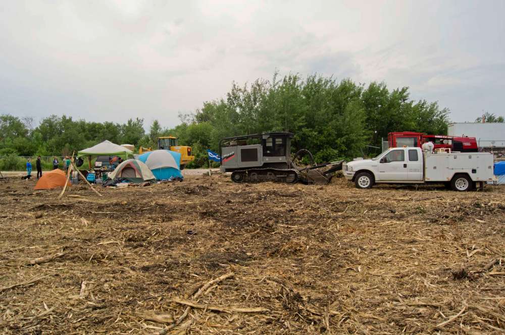 Since July 14, about a dozen people have occupied land behind the Winnipeg Humane Society, off of Parker Avenue, blocking machinery that had been used to clear cut about 15 acres of forest. The land is owned by developer Gem Equities which plans to build a new transit-oriented residential development called Oak Grove on the site.