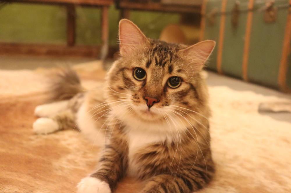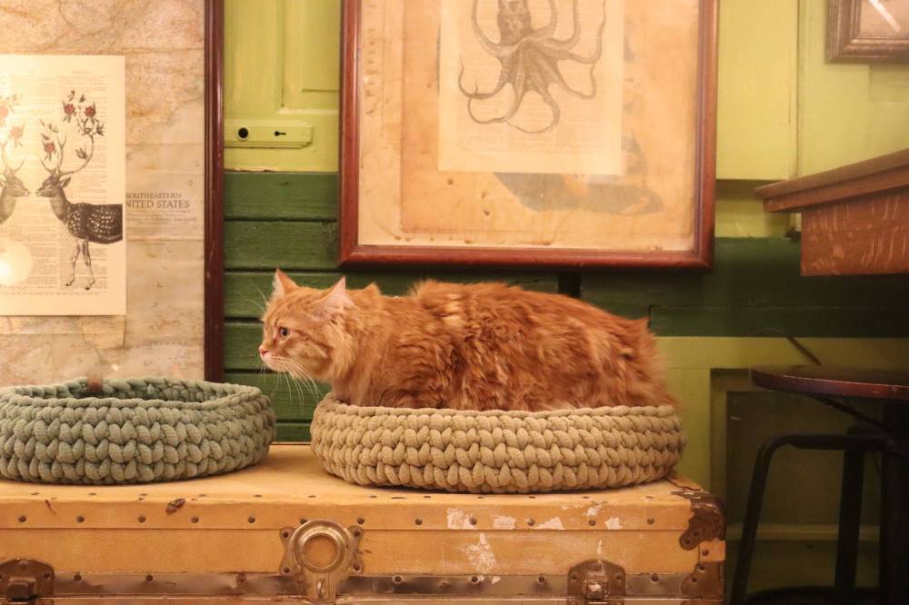 Longhaired cat Coffee is the “cafe owner.” He’s one of the three cats currently at the shop, all belonging to the owners.