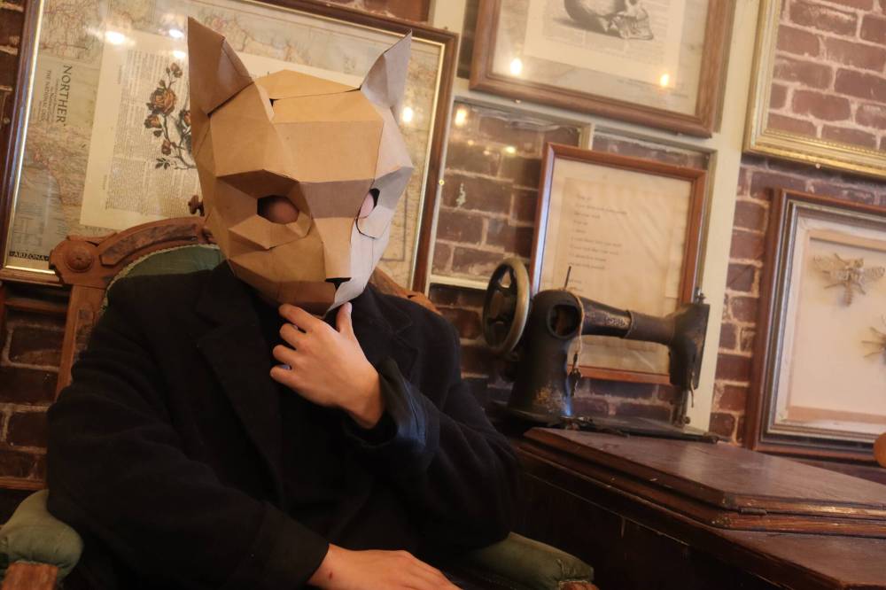 The cafe’s co-owner, Ségard Reedson, uses the 3-D paper cat mask as an artist persona for social media and promotions.