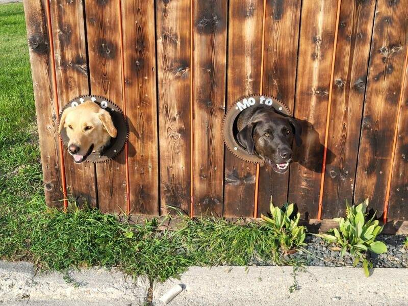 Longtime Wildwood resident Brandt Klassen created holes using clutch discs from scrap machinery to give his pups a view of the neighborhood action. The pups usually go to their own holes properly labelled by name.